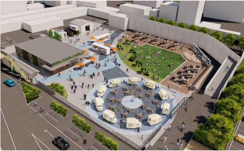 暫定利用施設は、将来の開発事業を推進するために、お客への期待感醸成やエリア周知を目的にプレ事業として実施する。計画は、京橋を訪れていない人たちにも新たな発見や出会いを提供できる場とする。施設内には、休憩やイベントが開催できる駅前広場、レストランなどの導入を予定している。