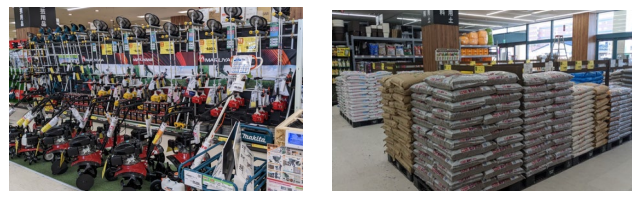 園芸用品・ペット用品や家電・日用品など地域の生活ニーズに対応した品揃えを行う。また、職人が使用する工具・農家向けの資材まで、価格を抑えた商品を多数ラインアップし、地域の「住まいと暮らし」をサポートする。