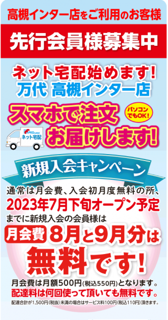 7月下旬から高槻市を対象としたネット宅配サービスの開始が予定されていて、すでに専用サイトでは会員の先行募集を進めている。