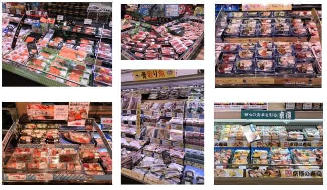 水産売場では、まぐろ、サーモンをコーナー展開する。買ってすぐに食べられる「家飲み」商品を小鉢イメージのトレーで展開する。高品質で新鮮な「東信水産」の刺身、「京樽」鮨などの専門店の商品や、子どもや年配の顧客でも安心して食べられる「骨取り魚」を展開する。