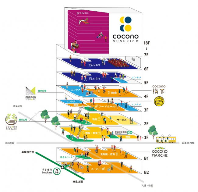 その他、各階にあるエンターテイメント店舗など、ランチ、ディナー、深夜のシメまで、様々な食シーンに対応するすすきのの新しい食の空間を提供する。また、3階に設けた屋内広場「COCONO SQUARE(ココノ スクエア)」は、日常的な憩いの場として利用だけでなく、さまざまなイベントの開催スペースとなる。