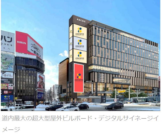また、日本有数の繁華街・すすきのの玄関口「すすきの交差点」にて、建物と合わせて新たな街のシンボルのひとつとなることを目指し、外壁上部に北海道最大のビルボード、デジタルサイネージを設置する。広告に限らず、施設・地域情報など、思わず目を向けたくなる情報を発信することで、街のメディアとしての役割を担う。