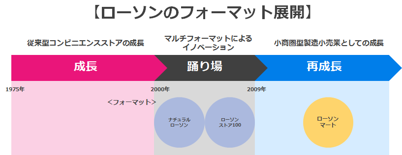 コンビニ市場が飽和を迎える中で、ローソンはコンビニ業態が細分化されることを明確に意識し、2000年頃からマルチフォーマット戦略を実行してきた。その成果はナチュラルローソンやローソンストア100として結実した。