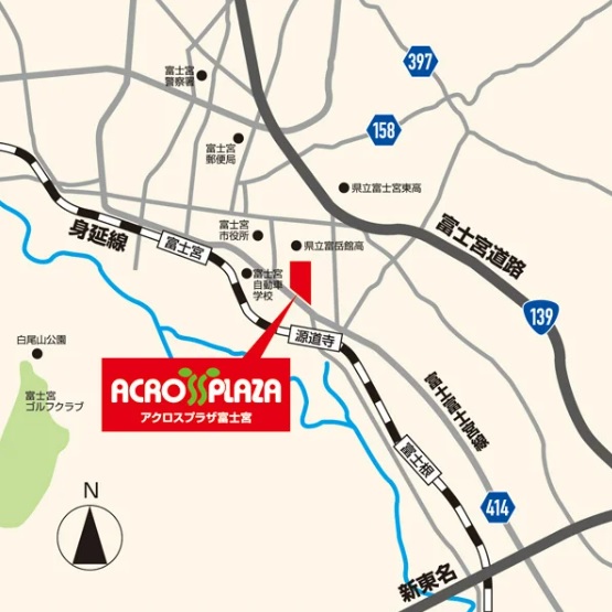 「アクロスプラザ富士宮」は、JR東海身延線「源道寺駅」より徒歩約8分、静岡県道414号富士富士宮線沿いに立地する。