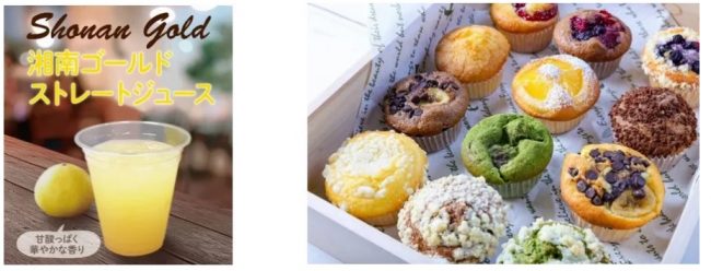 併設するカフェブリッコでは、自慢の手作りマフィンに加え、地元神奈川で栽培されたゴールデンオレンジと温州みかんを掛け合わせた品種、「湘南ゴールド」を使った湘南ゴールドストレートジュースを提供する。