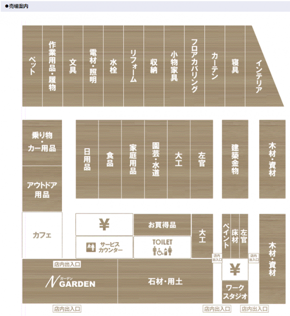 直方店の売場面積は約2700坪。ナフコが主力とするホームセンタータイプでの出店となる。店舗前面にはNガーデンと名付けた園芸売場を配置し、カフェを隣接させた。またPB比率が70%となる小物家具、ホームファッション関連を売場奥に配置したゾーニングとなっている。