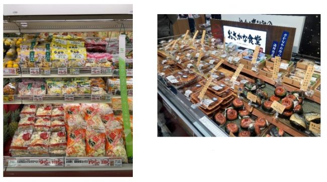 左/青果コーナーのカット野菜コーナー 右/水産コーナーの「おさかな食堂」