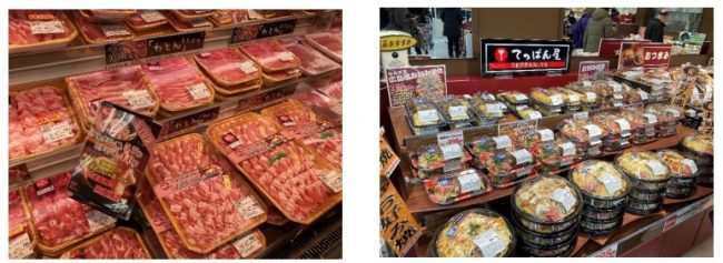 左/食肉コーナーの「和豚もち豚」 右/デリカコーナーの鉄板調理メニュー