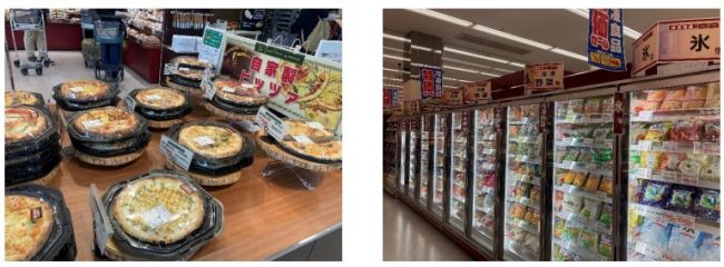 左/ベーカリーコーナーの「自家製ピザ」 右/冷凍食品コーナー