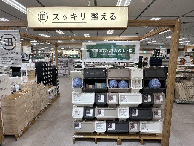 スリムなスタンドほうきや使い捨てファイバークロスなど手軽な掃除用品や収納できる室内物干しなどを集合させた「ピカピカを極める」、収納用品や重ねて整理しやすい食器・調理器具を揃えた「スッキリ整える」、睡眠関連を揃えた「スヤスヤを叶える」など都心生活ならではの需要に向けたカインズのオリジナル商品群を4つのエリアに分けて展開する。