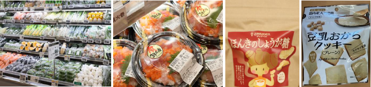 従来のドラッグストアで取り揃えている一般食品、酒類、冷凍食品に加え、スーパーマーケット同様に、野菜や果物、肉、魚、出来立て惣菜までを品揃えする。また、九州地域バイオクラスター推進協議会と連携して、熊本県産生姜を甜菜糖で煮詰めた “本気のしょうが糖” をはじめとした、健康に配慮した菓子のほか、地元熊本県産の商品も取り揃える。