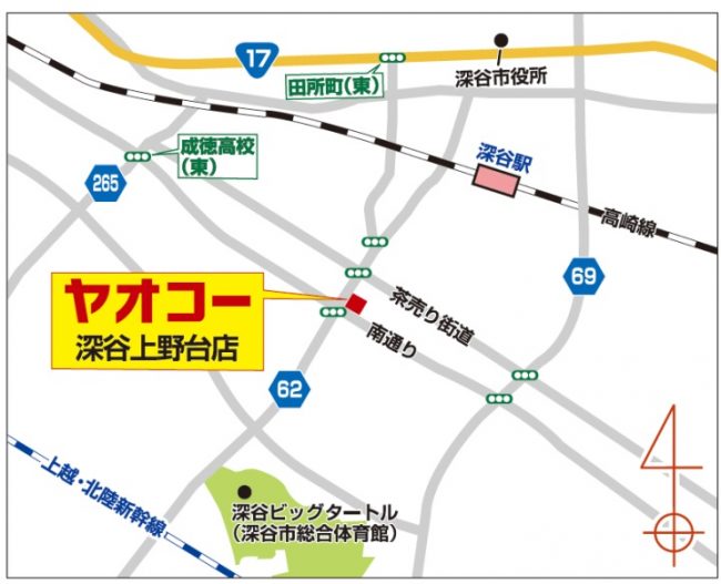 「ヤオコー深谷上野台店」は、JR高崎線「深谷駅」から約820m、県道62号線に面した車通りの多い地域に位置する。店舗周辺は平坦で徒歩や自転車、自動車でもアクセスしやすい。また、南大通りには深谷市市営のバスが運行している。