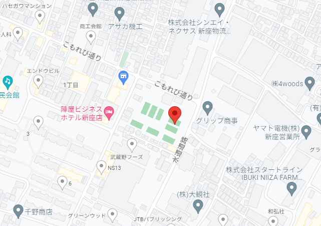 新座野火止店は新座駅から南東に約2㎞。朝霞市と東京都東村山市を結ぶ通称水道道路と呼ばれる市道沿いに立地。近隣には事業所が立ち並び、新座市役所、市民会館があるなど公共交通でのアクセスが容易な地点にある。