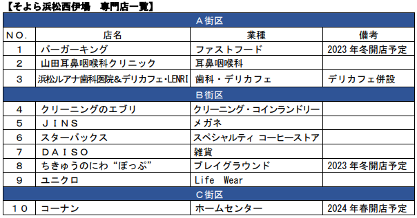 専門店数/10 店舗(うち、2023 年冬開店予定2店舗、2024 年春開店予定1店舗)