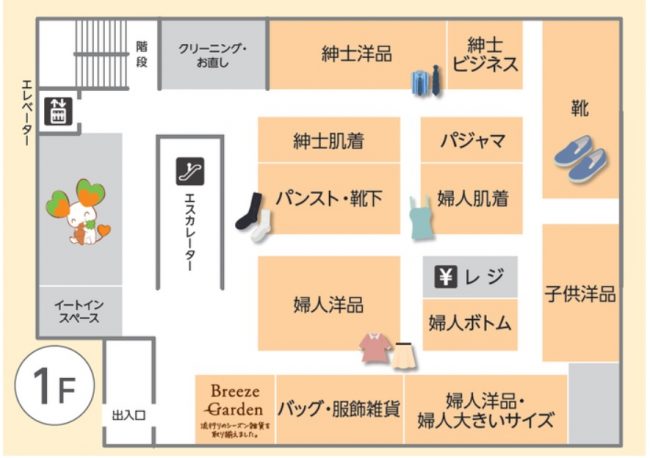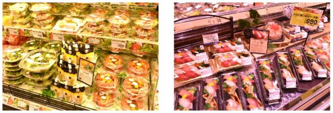 今回の改装では、単身世帯が多い地域特性に合わせて、新店などで好評の「お店で作った新鮮サラダ」や「うを鮨」コーナー、「ミートオードブル」コーナーを導入した。1階の衣料品売場には、かわいい雑貨を中心に集めた「ブリーズガーデン」のコーナーを設けた。