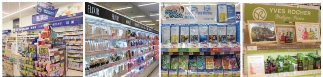 医薬品売場では登録販売者、化粧品売場では専門スタッフが、お客の悩みや要望を聞きながら、美と健康をサポートする。また、日用雑貨売場では、ヘアケア、オーラルケアをはじめ、ベビー用品、介護用品、ペット用品も品揃えする。