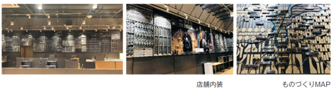 また店舗の特徴として、金属加工が主要産業の燕・三条地域の42企業の協力を得て、生産工程で出る金属板など廃材を店舗内装に活用している。協力した加工業者・工場は、店内に掲示する「ものづくりMAP」に所在地を記している。