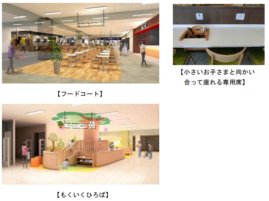 専門店は「3COINS」と「JINS」が新たに出店する。フードコートは内装を一新し、環境の改善を図る。子ども連れのお客が快適に利用できるよう、向かい合って座ることができる専用の席を新設するほか、安全な子ども用の椅子の入れ替えを実施する。また子どもの遊び場「もくいくひろば」を設置する。