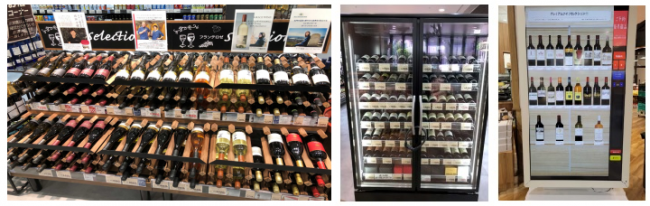 ワインコーナーでは、女性ソムリエが厳選したワインが多数並ぶ。高額ワインはワインセラーに陳列される。また売場には商品を予約販売できるデジタルサイネージを設置する。