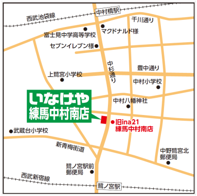 同店は1979年10月に開店し、2010年4月に「ina21 練馬中村南店」としてリニューアルしたが、2023年10月29日(日)に閉店。新たに道路の向かい側にスクラップ&ビルドでオープンさせる。