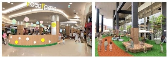 2階のフードコート「FOOD FOREST」は、椅子やテーブルのほか、キッズコーナーを木目を基調としたデザインに刷新する。また、フードコート外のテラス席「Nogata Terrace」には、ゴムチップ・人口芝を敷設し、パラソルチェアやウッドチェアを配置する。テラスからは福智山を臨むことができる。