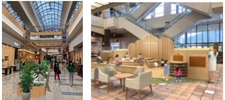 館内共用通路の天窓は、遮熱効果のあるガラスを採用し、天井から光が射す空間に改修する。また、1階の子どもの遊び場「モクイクひろば」の一部には間伐材を用いることで、地域の森林の環境保全にも配慮している。