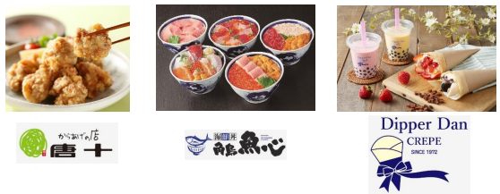 飲食店では、1階の食物版エリア「Nogata Marche」には、北九州で人気の唐揚げ専門店「唐十」が直方市内に初出店する。名産品の直売広場「わくわく広場」は面積を拡大してリニューアルオープンする。2階のフードコート「FOOD FOREST」には、海鮮丼専門店「海鮮丼 角島魚心」、クレープで人気の「ディッパーダン」がオープンする。