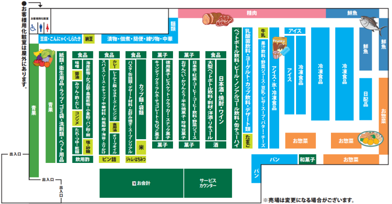旧エコス上広谷店は9月25日から改装休業を行った。同店のレイアウトは店舗入口から時計回りの動線で。青果、日配、精肉、鮮魚、惣菜が壁面に沿って並ぶ。