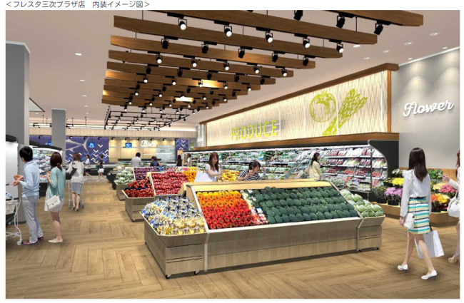 三次プラザ店のコンセプトを「三次の美味しいものと、フレスタの美味しいものを楽しいお買い物で」として、三次市を中心とした県北部広域を商圏とした店舗づくりを行う。