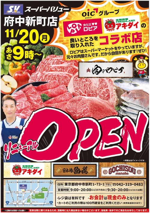 (株)スーパーバリュー(埼玉県上尾市、岸本圭司社長)は11月20日(月)、東京都府中市に「府中新町店」を改装オープンする。