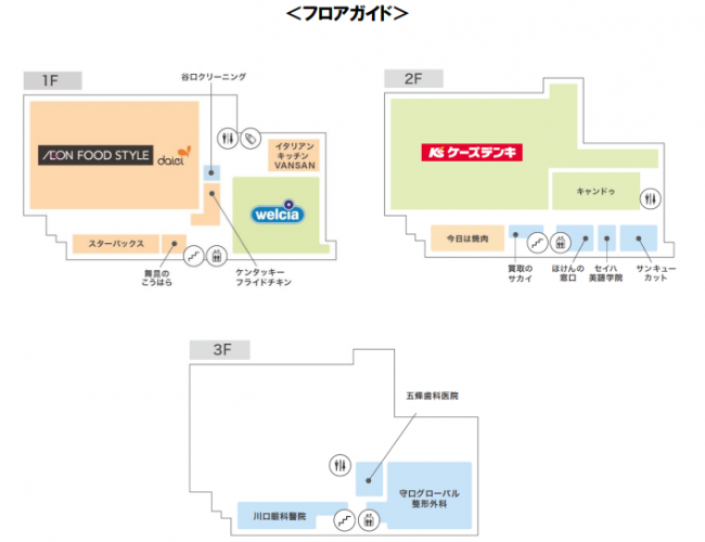 一方、テナントはデイリー需要に対応した物販を揃える。ケーズデンキ、キャンドゥ、ウエルシア薬局が出店する。飲食では大手口コミサイトでも高評価を獲得する「板前焼肉一牛」の新フォーマット「今日は焼肉」が初出店する。また全国で71店舗展開する家族で気軽に行けるイタリアンレストラン「VANSAN」が出店する。その他、クリーニング、クリニックなどサービス系テナントを揃える。