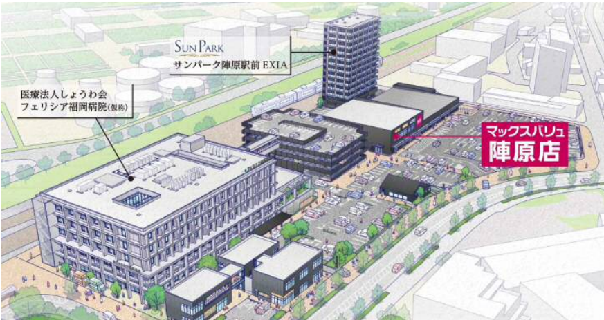 JR陣原駅南口に計画中の東折尾地区プロジェクトへの出店で、店舗はJR黒崎駅とJR折尾駅の中間に位置する。国道3号が近く、若松~八幡西区間を結ぶ県道が通る利便性に優れた立地だ。