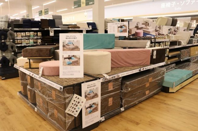 インテリアコーナーでは、複数のブロックを自由に組み合わせて使用するブロックソファーなど、一人ひとりのライフスタイルに合わせた商品を展開する。
