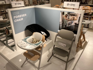 cybexやSTOKKEなどさまざまな種類を展開する。実際に座り比べができるので、ぴったりのチェアを見つけやすい。