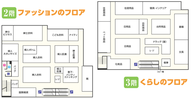 2階「ファッションのフロア」では、婦人服・紳士服・子ども服・服飾雑貨・靴などを展開する。また3階「くらしのフロア」では、日用品売場を大幅に刷新した。ニーズが高まっているペットフード売場を拡大する。定番商品からペットの健康に配慮した商品まで、幅広いニーズに対応する商品を揃える。