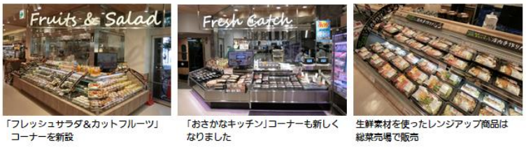 今回の改装では青果売場に「フレッシュサラダ&カットフルーツ」コーナーを新設し、総菜売場奥にインストアベーカリー「ダン・ブラウン」を導入した。また2階の衣料館「コルモピア」はレイアウトを変更し、家庭用品を1階から移して拡大した。