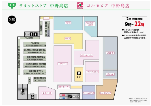 家庭用品を移した2階も大幅リニューアルした。衣料館「コルモピア」もレイアウトを変更し、コンパクト化した。レディースを中心に、メンズやキッズのアウターやインナー、シューズ・バッグ、寝具・服飾雑貨等を品揃えする。また、ベビー関連用品は、ベビーフード、おむつなどまとめてコーナー化した。