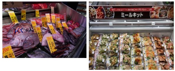 鮮魚では旬の魚の刺身、産地直送の鮮度ある近海魚の対面販売や酒のつまみ、おかずに「お手軽シーフード」を提供する。