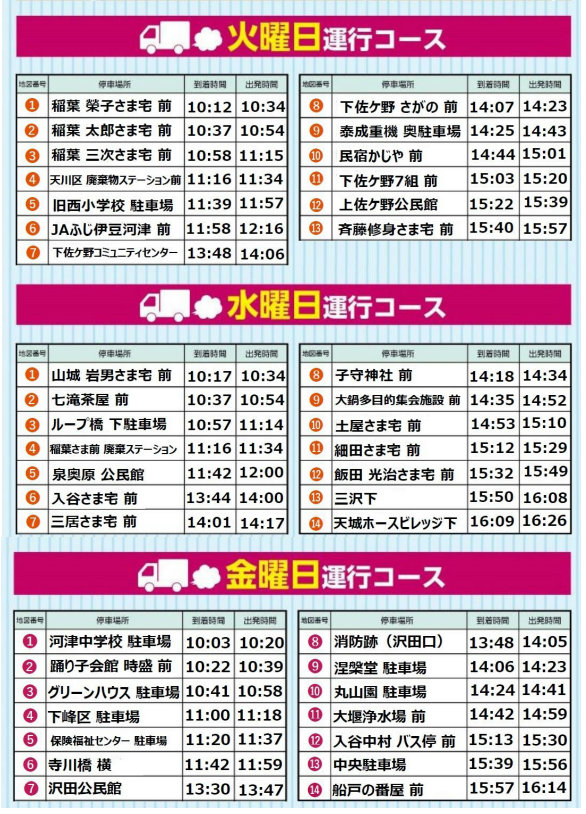移動スーパーは、火・水・金曜日にそれぞれのコースで河津町エリアを運行する。