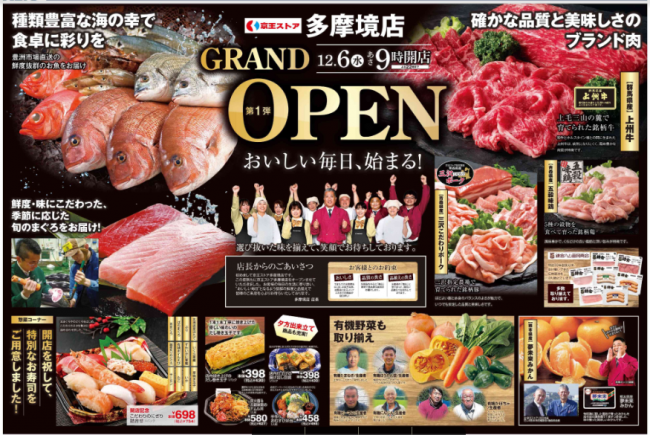 多摩境店の売場は青果は旬や産地を前面に出した果物や有機野菜を取り入れる。精肉は群馬県産上州牛、青森県産三沢こだわりポーク、青森県産五穀味鶏など銘柄種を揃える。惣菜売場は夕方のピークに対応して揚げ出し豆腐、だし巻き卵などの出来立て商品を揃える。