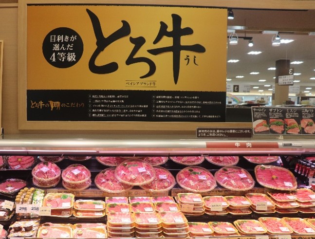 精肉コーナーでは、プロの目利きが厳選した肉質4等級以上の牛を一頭買いするオリジナルブランド牛「ベイシア とろ牛」を展開する。週末はまとめ買い需要に対応し、肉のジャンボパックや簡便商材ジャンボパックの展開を強化する。