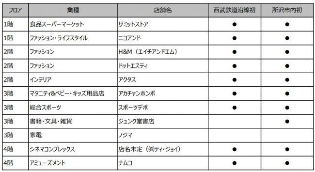 30~40代のファミリー世帯を中心にニーズが高いファッションのドットエスティやH&M、インテリアのアクタス、アカチャンホンポ、スポーツデポ、ナムコも西武鉄道沿線初・所沢市内初だ。