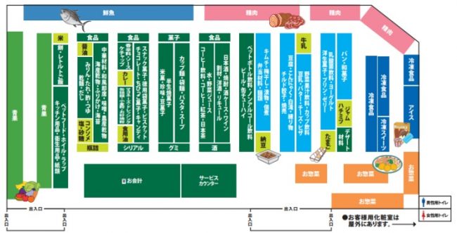 同店の出入口は2カ所設けられている。左側の店舗入口から入ると、時計回りに青果、鮮魚、精肉、冷凍食品、惣菜が壁面に沿って並ぶ。