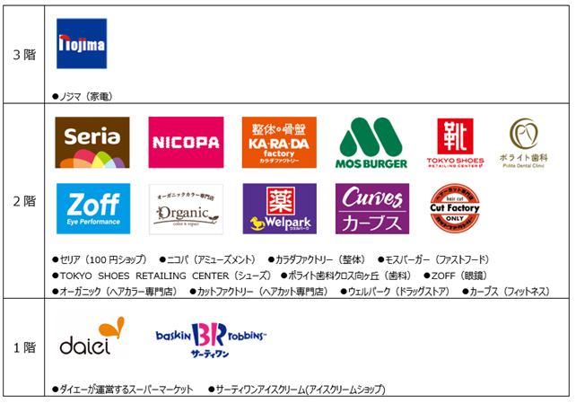 核店舗であるダイエーのほか、家電量販店のノジマ、モスバーガー、サーティワンアイスクリームなどのフードサービス、100円ショップのセリアなど14店舗の出店が予定されている。