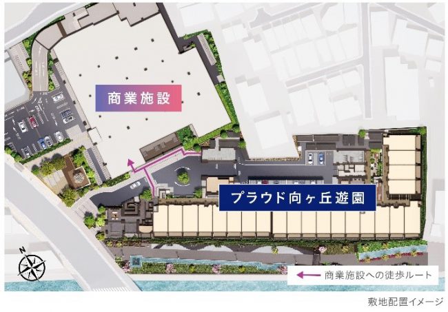 マンションから「クロス向ヶ丘」までは屋根付きの通路を設けることで雨天における買い物の利便性を確保する。小田急線沿線では、2012年以降、駅徒歩5分以内かつ敷地面積が1万㎡超の商業施設一体マンションは「プラウド向ヶ丘遊園」のみであり、入居者だけでなく、近隣地域からの利用も想定する。