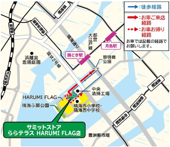 ららテラス HARUMI FLAG店の最寄り駅は、店舗から0.8kmに位置する都営大江戸線「勝どき駅」で徒歩17分と少し距離はあるものの、橋の一部を除いてほぼ平坦でアクセスできる。晴海・勝どき・月島エリアのスーパーマーケットは小型店舗が多く、600坪を超える大型店は同店のみとなる。