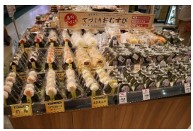 デリカ売場では、昼食や夕食の時間帯に合わせて出来たての商品をタイムリーに提供する。手づくりおむすび、サラダ、惣菜やお寿司などの拡充や、小容量など買やすい量での品揃えの充実を図る。