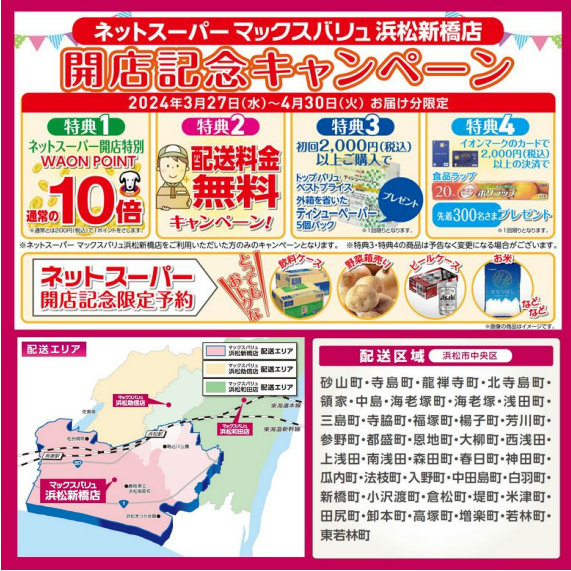 また、「マックスバリュ浜松新橋店」のオープンに合わせて、浜松市中央区(旧南区)を配送エリアとするネットスーパーを開設する。4月30日(火)までは、オープニング企画として配送料無料キャンペーン、WAONPOINT10倍企画、ティッシュペーパープレゼントなどお得なイベントを開催。また、「子育てママ応援キャンペーン」「シニア支援キャンペーン」として、6才以下の子供がいる顧客と65歳以上の顧客に、配送料無料クーポンを配布する。