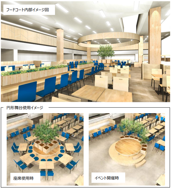 フードコート壁面やテーブルなどお客が身近に触れる箇所を中心に、大阪府内産木材をふんだんに使用した温かみのある内装へとリニューアルする。またフードコート中央には可変式のサークル状座席を設け、座席としてだけではなく、催事やイベントに利用できる円形舞台としても使用していく。小規模のコンサ-トや地域イベントも開催し、フードコートを単なる飲食空間ではなく、より多くの地域住民が楽しみ、集う空間にしていく。