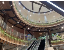 1階エキマエコートの吹抜けは、植栽のグリーンとナチュラルな木目調のデザインを採用して一新した。「エシカル」をテーマにしたエキマエを代表するメインコートに生まれ変わる。